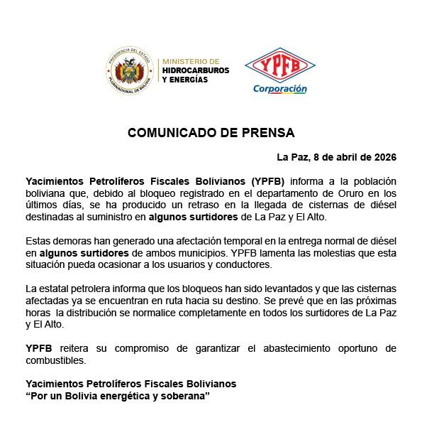 La Paz, 8 de abr 2026 (ATB Digital).- YPFB informó que los bloqueos registrados en el departamento de Oruro provocaron retrasos en la llegada de cisternas de diésel, afectando el suministro en algunos surtidores de La Paz y El Alto.