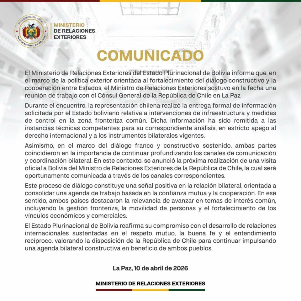 La Paz, 11 de abr 2026 (ATB Digital).- El Ministerio de Relaciones Exteriores del Estado Plurinacional de Bolivia informó que, en el marco del fortalecimiento del diálogo y la cooperación internacional, se desarrolló una reunión de trabajo entre el canciller boliviano y el cónsul general de la República de Chile en La Paz.
