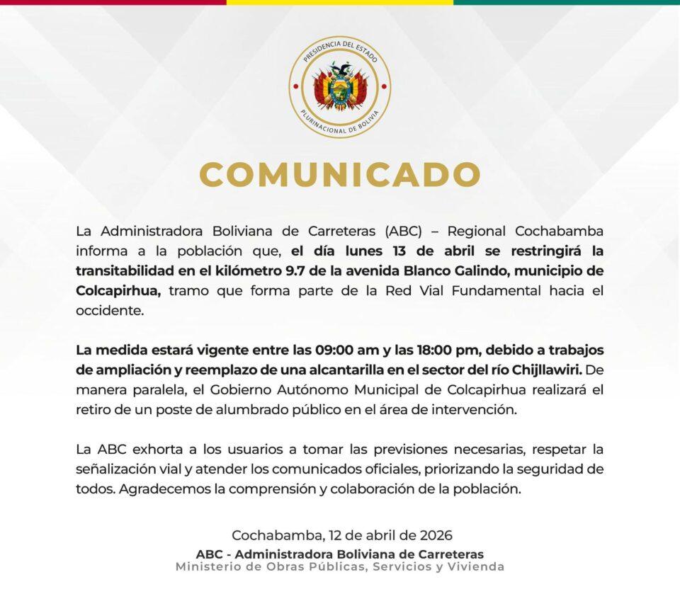 Cochabamba, 12 de abr 2026 (ATB Digital).- La Administradora Boliviana de Carreteras (ABC) informó sobre la restricción de transitabilidad que se implementará este lunes 13 de abril en el kilómetro 9,7 de la avenida Blanco Galindo, en el municipio de Colcapirhua, vía que conecta con el occidente del país. De acuerdo con el comunicado oficial, la medida estará vigente desde las 09:00 hasta las 18:00.