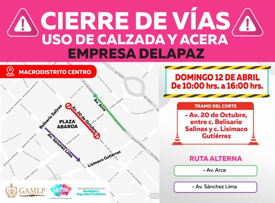 La Paz, 12 de abr 2026 (ATB Digital).- El Gobierno Autónomo Municipal de La Paz comunicó el cierre temporal de vías en el sector comprendido entre la avenida 20 de Octubre, la calle Belisario Salinas y la calle Lisímaco Gutiérrez, en la ciudad de La Paz. De acuerdo con el reporte oficial, la restricción vehicular se aplicará este domingo 12 de abril desde las 10:00 hasta las 16:00.