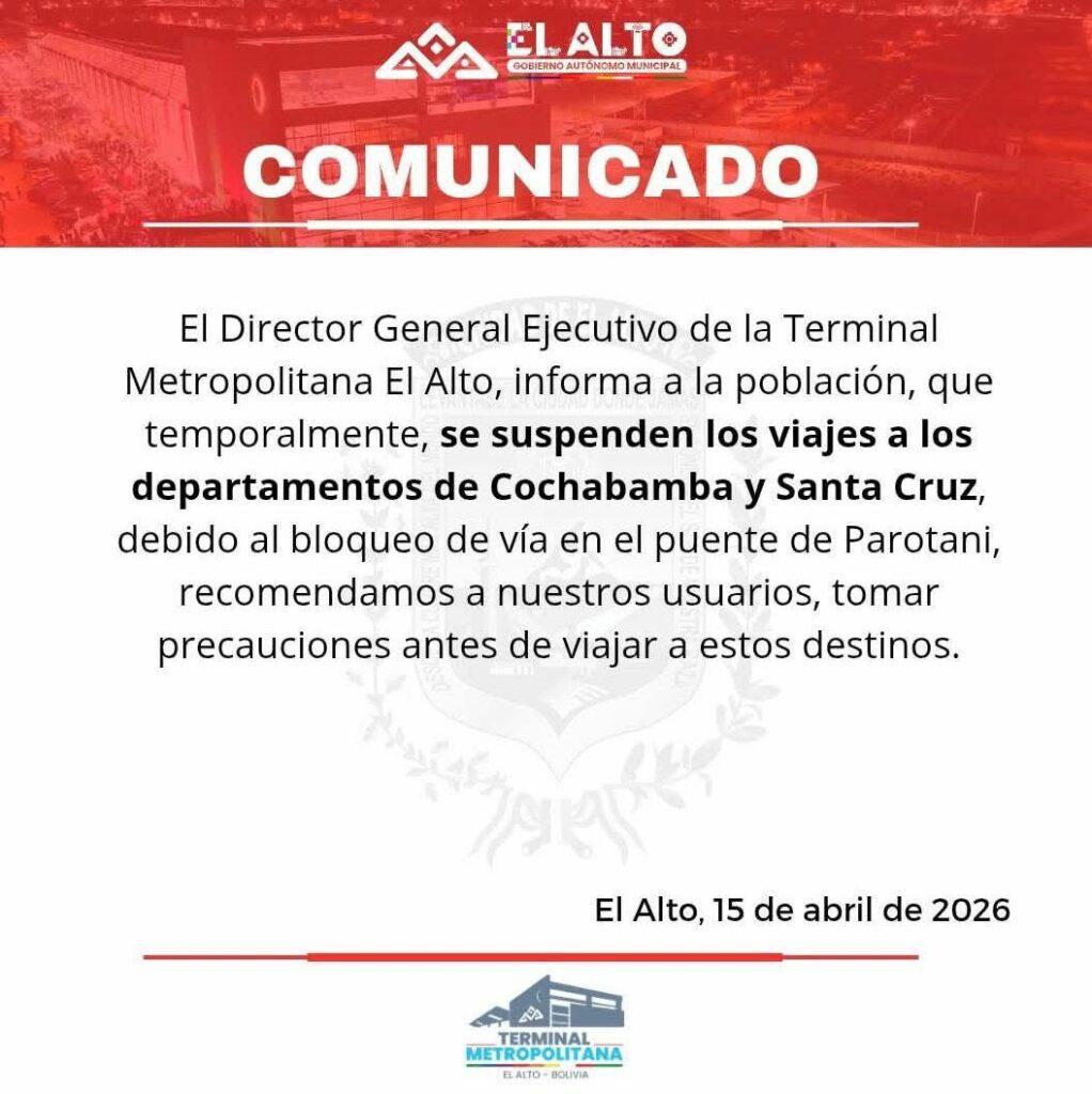 La Paz, 15 de abr 2026 (ATB Digital).- La Terminal Metropolitana de El Alto informó la suspensión temporal de los viajes hacia los departamentos de Cochabamba y Santa Cruz, debido al bloqueo de vías en el puente de Parotani.