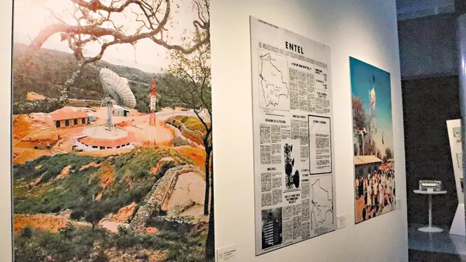 La exposición presenta imágenes inéditas de hitos trascendentales como la implementación de las estaciones terrenas Tiwanaku en La Paz y La Guardia en Santa Cruz, infraestructuras que conectaron a Bolivia con el mundo mediante enlaces satelitales.